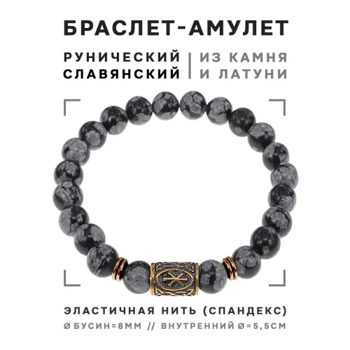 Браслет со славянской руной Рок и нат.камнем Снежный обсидиан, 8мм BSRN-13-14