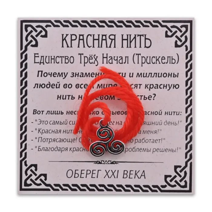 Красная нить из 100% шерсти, упакованная в прозрачный пакетик с отверстием под крючок. В комплекте имеется подвеска-талисман и вкладыш. Красная нить на левом запястье символизирует защиту от злых духов и плохой энергии. Этот оберег имеет глубокие корни в древних традициях: в Древней Руси она использовалась для защиты, а по восточным поверьям приносит счастье. Знаменитости по всему миру носят красную нить, следуя учению Каббалы, где считается, что она помогает исполнить заветные желания и защищает от сглаза. Завязывание нити — это ритуал, который лучше всего проводить с человеком, которому доверяется. Если нить порвалась — это знак того, что она выполнила свою защитную функцию.