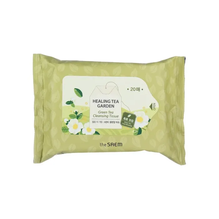 Очищающие влажные салфетки Healing Tea Garden Greentea Cleansing Tissue от корейского бренда The Saem представляют собой удобное и эффективное средство для ухода за кожей лица. Эти салфетки пропитаны натуральной концентрированной эссенцией с экстрактом зелёного чая, который известен своими антиоксидантными свойствами. Широкая поверхность салфетки позволяет легко и эффективно освежить кожу без использования мыла и воды.