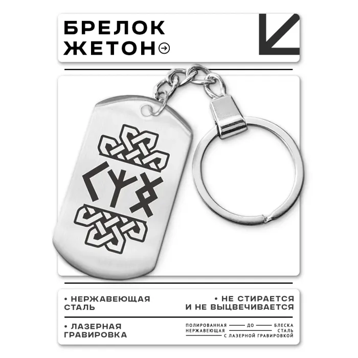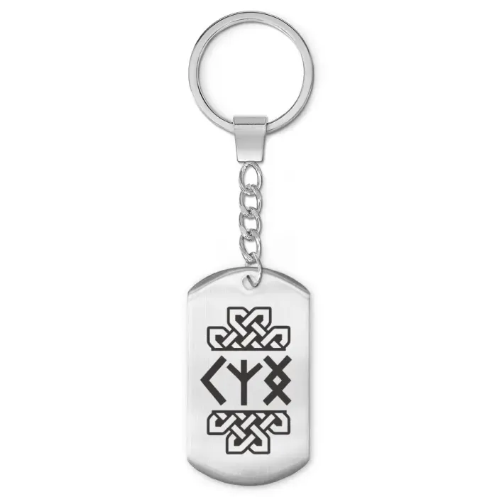 Брелок из нержавеющей стали с односторонней лазерной гравировкой рунических символов.
