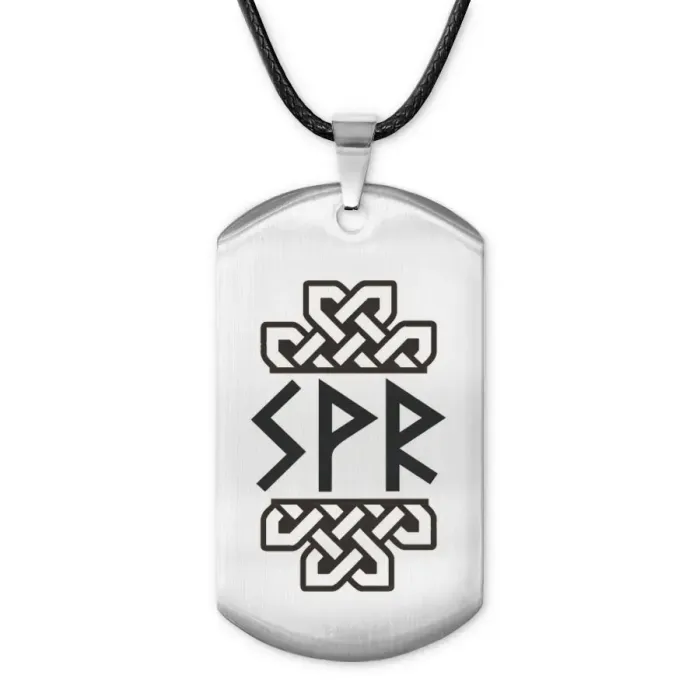 Амулет-жетон из полированной нержавеющей стали с лазерной гравировкой рун.