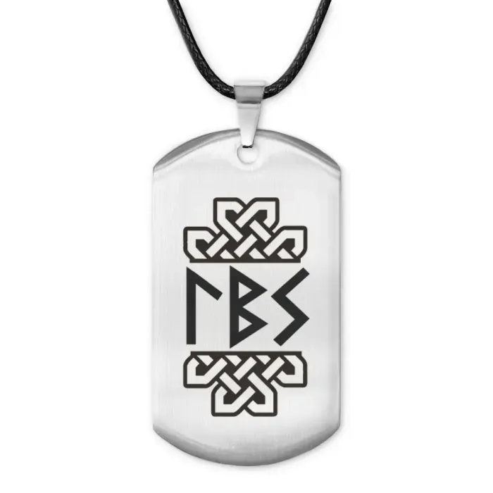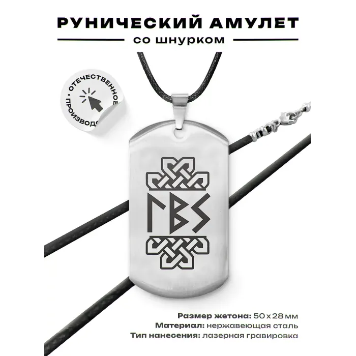 Амулет-жетон из полированной нержавеющей стали с лазерной гравировкой рун на одной стороне.