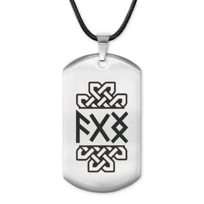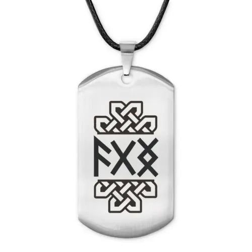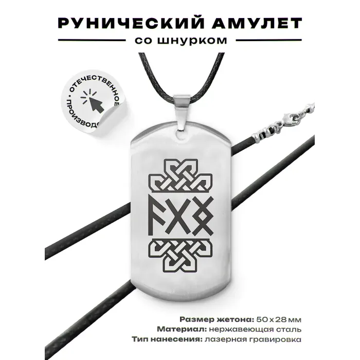 Амулет-жетон для ношения, выполненный из полированной нержавеющей стали с лазерной гравировкой рун.