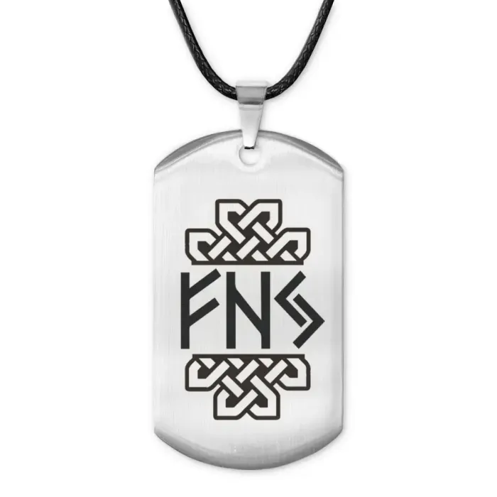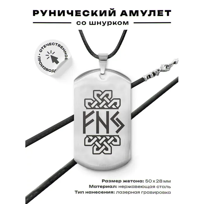 Амулет-жетон из полированной нержавеющей стали с лазерной гравировкой рун.