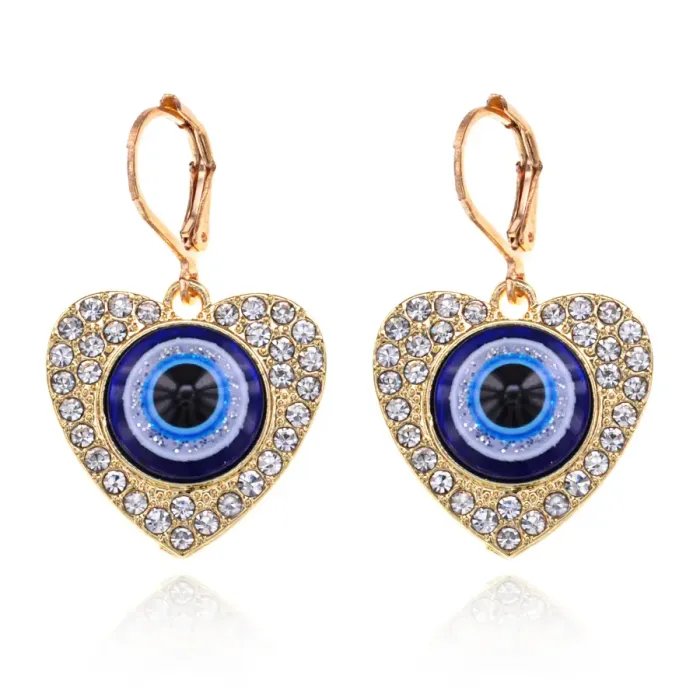 Серьги-оберег от сглаза в форме сердца, выполненные из бижутерного сплава со вставками из стекла и стразов.