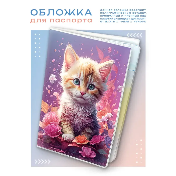 Эта обложка для паспорта с изображением милого котёнка в цветах станет не только стильным аксессуаром, но и надежной защитой документа. Изготовленная из прозрачного ПВХ пластика, она обеспечивает видимость данных паспорта, сохраняя его от повреждений и загрязнений.