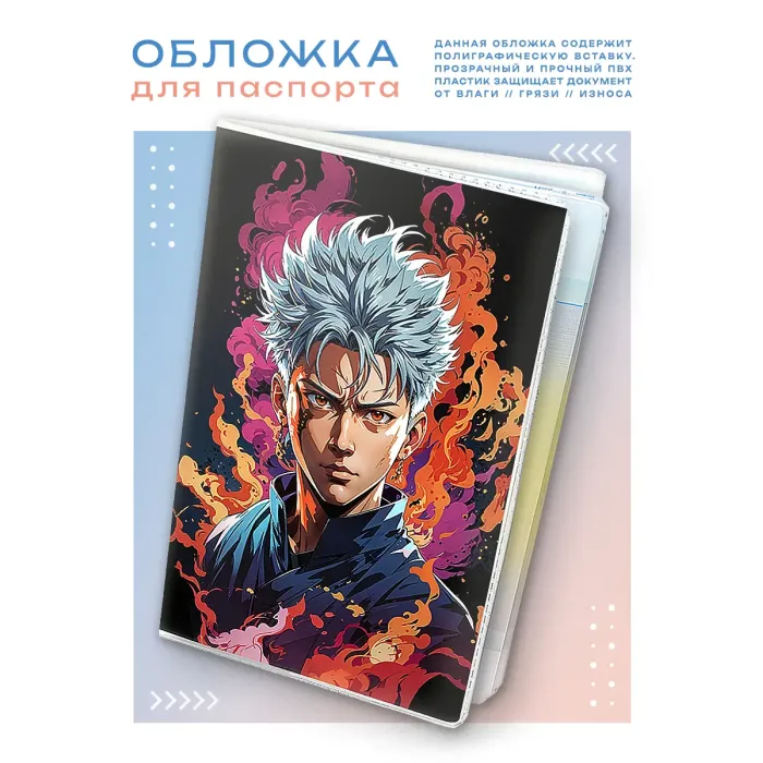 Обложка для паспорта из прозрачного ПВХ пластика с полиграфической вставкой с изображением аниме-персонажа.