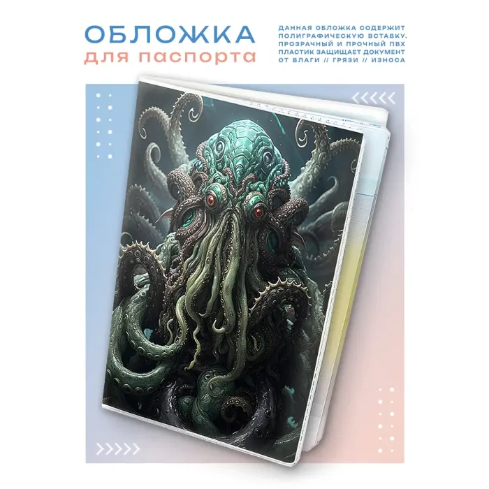 Обложка для паспорта из прозрачного ПВХ пластика с полиграфической вставкой по мотивам вселенной Зова Ктулху.