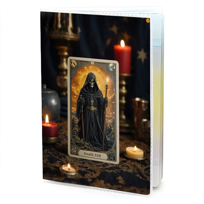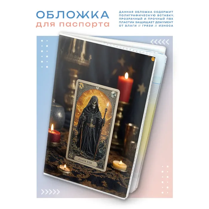 Обложка для паспорта из прозрачного ПВХ пластика с полиграфической вставкой, изображающей карту Таро 'Смерть'.
