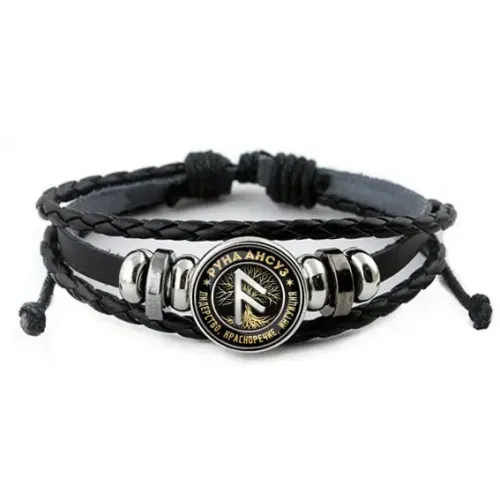 Кожаный браслет с металлической вставкой, изображающей руну Ансуз.