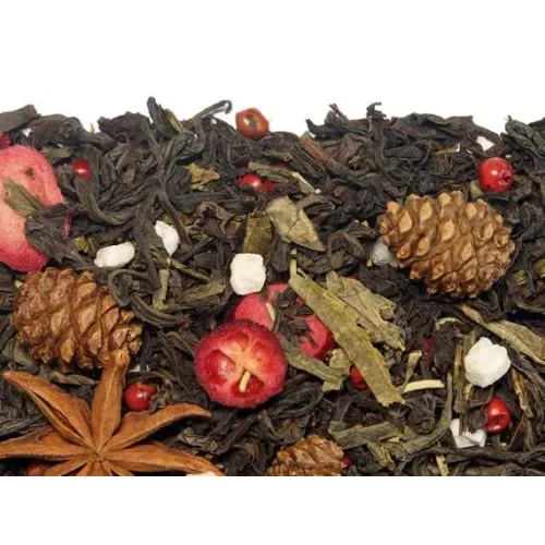 Этот праздничный купаж создан для зимнего настроения, сочетая в себе чёрный и зелёный крупнолистовой чай. Его характер определяют терпкая клюквенная кислинка, сладость лимонной цедры и пряное тепло бадьяна, дополненные хвойными нотами шишек и розмарина.