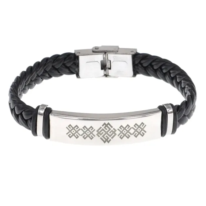 Плетёный кожаный браслет с гравировкой славянского символа Сварожич — это не только стильный аксессуар, но и мощный защитный талисман. Символ Сварожич традиционно ценится за свою способность оберегать от негативных влияний и помогать в трудные времена, поддерживая стремление к достижению благих целей.