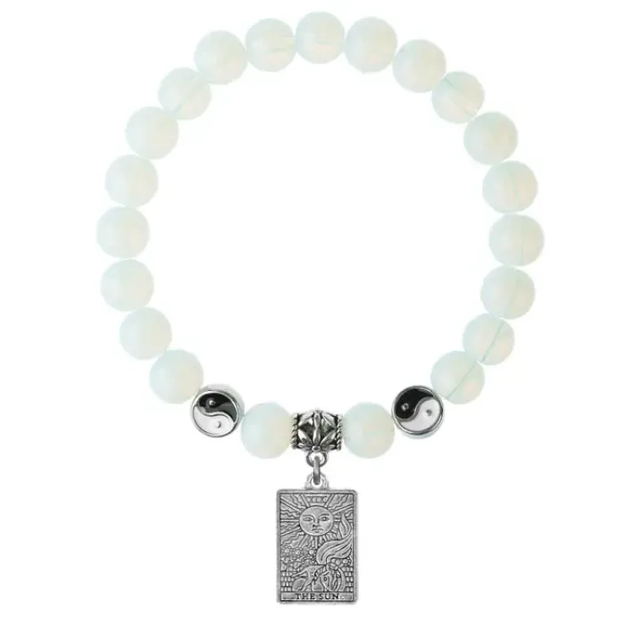 Браслет-сувенир из синтетического лунного камня (Опалит) с подвеской-талисманом в виде карты Таро "Солнце".