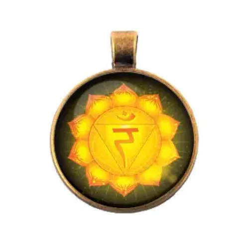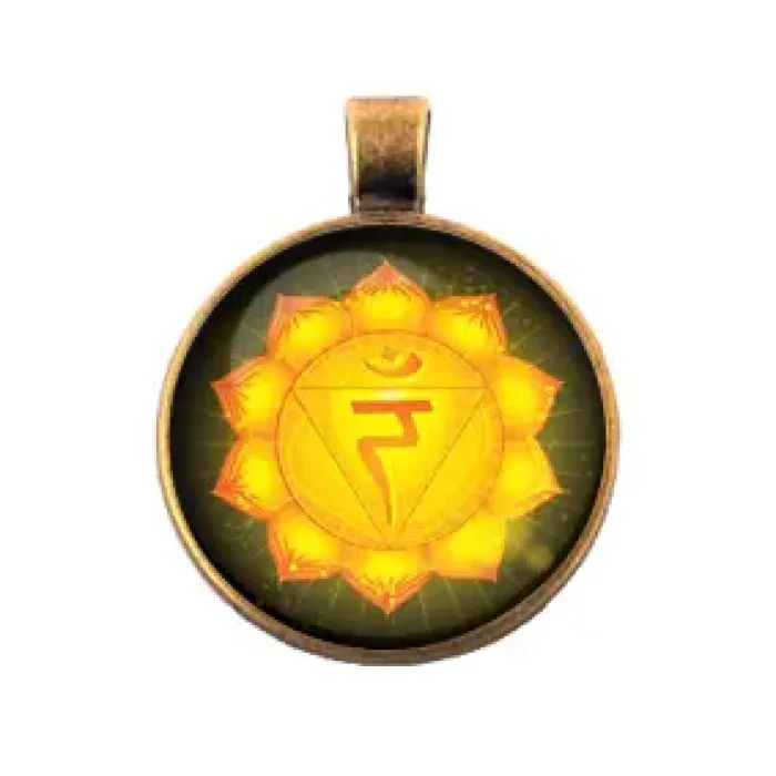 Амулет Манипура чакра — это стильный аксессуар, который не только привносит элегантность в образ, но и символизирует силу и уверенность. Этот амулет выполнен из бронзового цвета с выпуклой стеклянной линзой, что придаёт ему особый шарм.