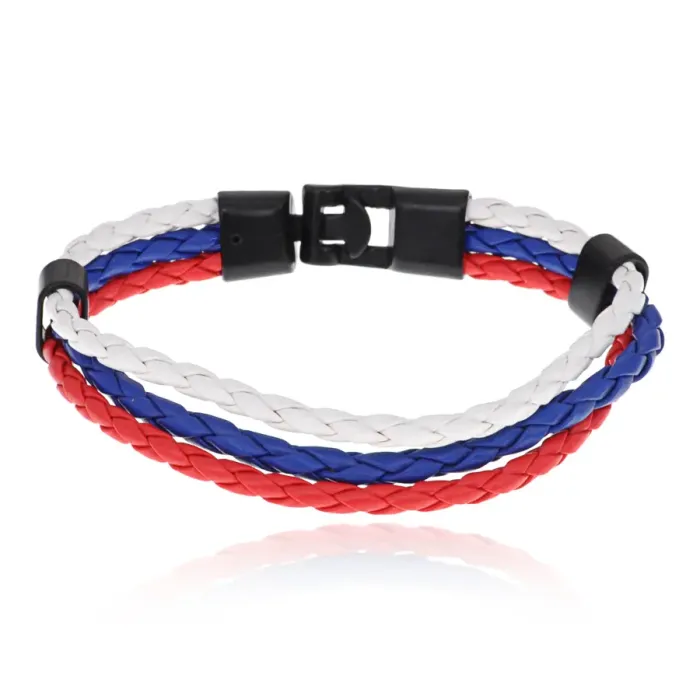 Браслет с изображением флага России. Изготовлен из кожи и пластика.
