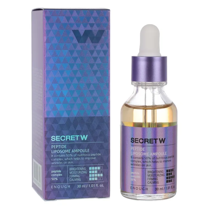 Эссенция для лица с пептидным комплексом Secret With peptide liposome ampoule от бренда Enough — это ампульная сыворотка, разработанная для улучшения состояния кожи. Содержит 50% пептидный комплекс, включая экстракты фукуса пузырчатого и стевии, а также экстракт листьев зеленого чая и гиалуроновую кислоту. Средство направлено на повышение эластичности и упругости кожи, а также сокращение морщин.