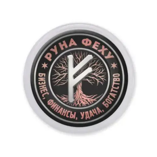 Акриловый магнит с изображением руны Феху. Сувенир круглой формы с защитным покрытием.