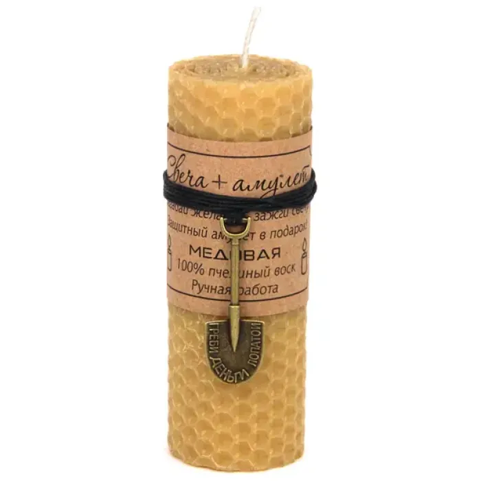 Свеча с Денежной Лопатой — это уникальный сувенир, который сочетает в себе красоту и символику богатства. Она изготовлена из 100% натурального пчелиного воска и обладает сладким медовым ароматом, создавая атмосферу уюта и тепла. Металлический амулет со шнурком добавляет изделию особую ценность и служит символом финансового благополучия.