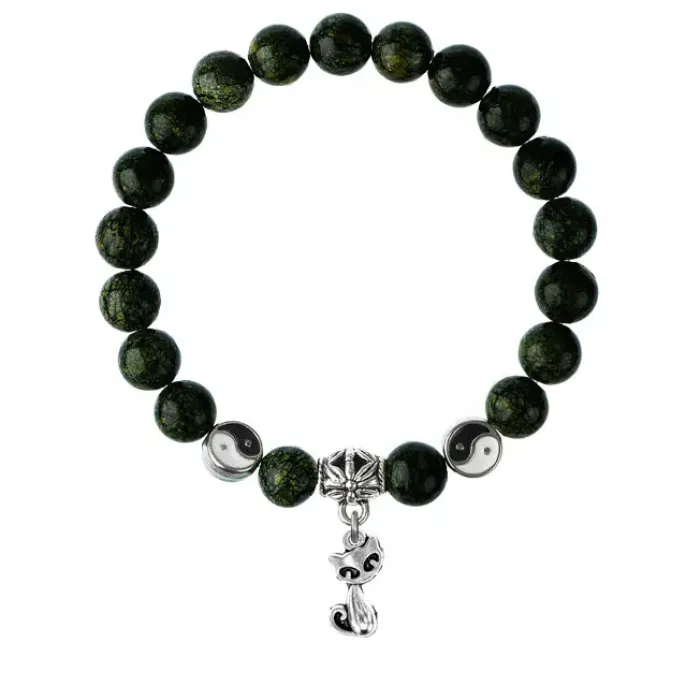 Браслет-амулет из натурального камня змеевик с подвеской в виде кошки из бижутерного сплава.