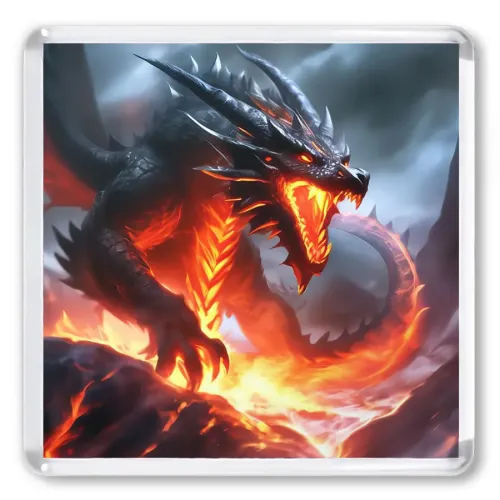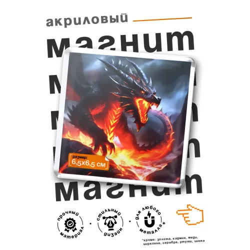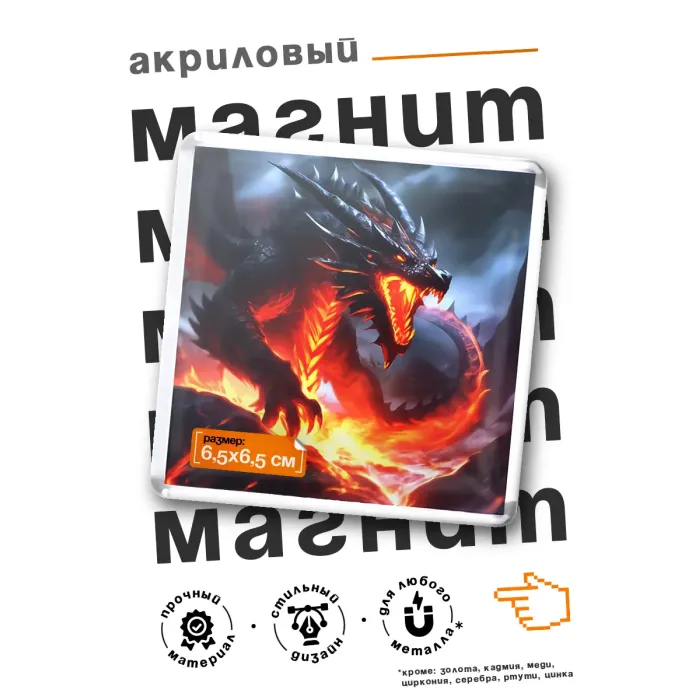 Акриловый магнит квадратной формы с изображением вулканического дракона.
