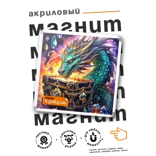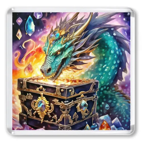 Акриловый магнит квадратной формы с изображением дракона и сундука.