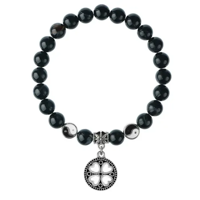 Браслет из натурального чёрного агата с подвеской в виде клевера.