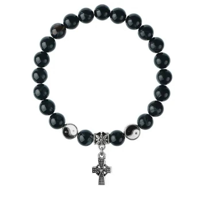 Браслет Крест (мудрость, гармония, процветание), Черный агат 8мм BSPE1-22-3004