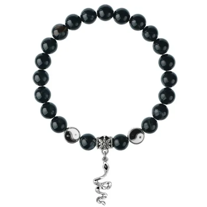 Браслет-амулет из натурального чёрного агата с подвеской в виде змеи.