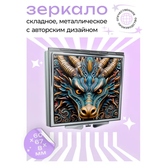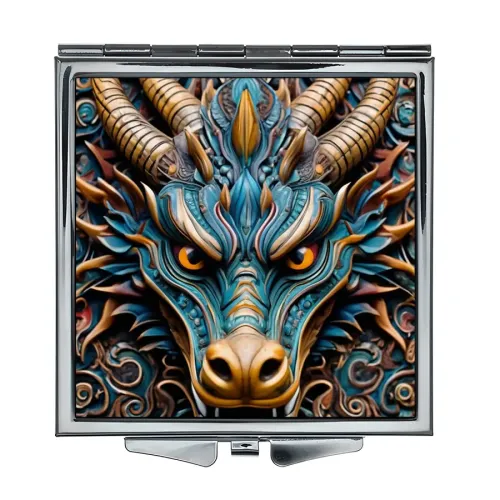 Складное зеркало квадратной формы с изображением дракона в анфас. Сувенирный аксессуар.
