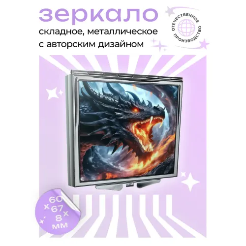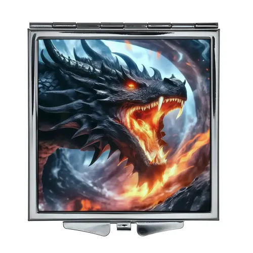 Складное квадратное зеркало с полноцветным изображением «Пламя дракона» на металле.