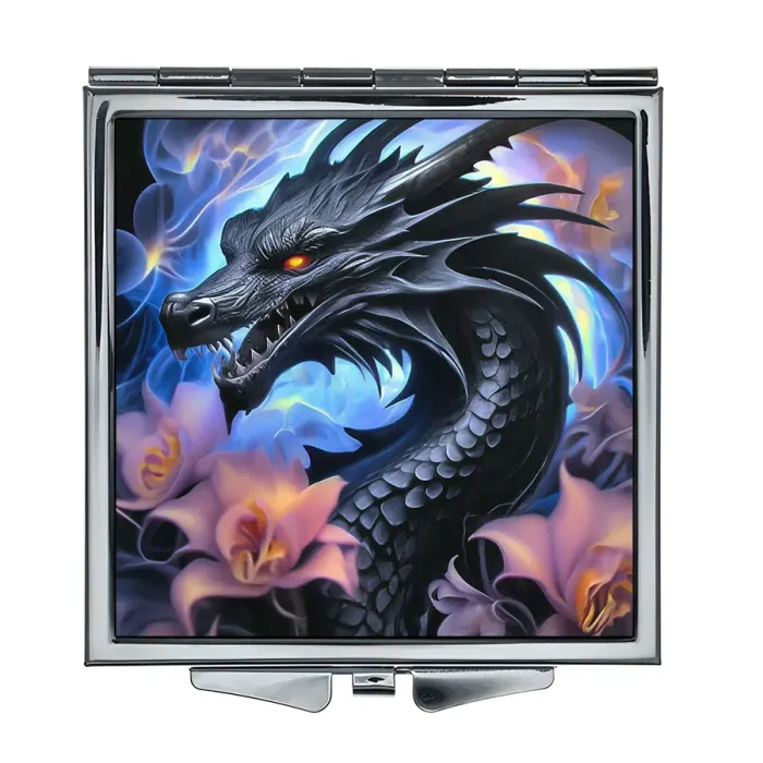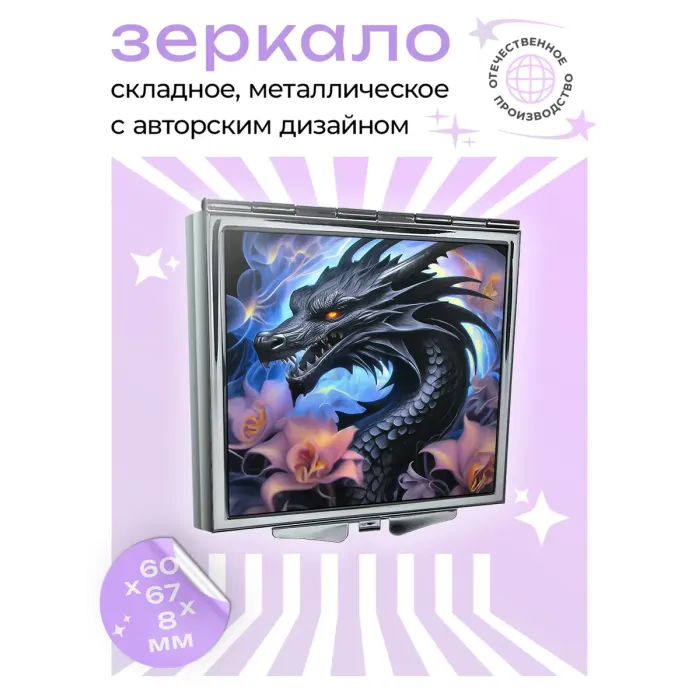 Складное зеркало квадратной формы для личного использования. Материал: металл и стекло. Дизайн: полноцветная печать с изображением дракона и розовых цветов.