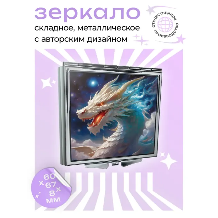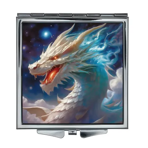 Складное зеркало квадратной формы с полноцветным изображением Белого дракона на металле.