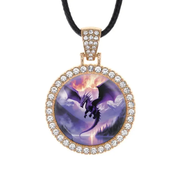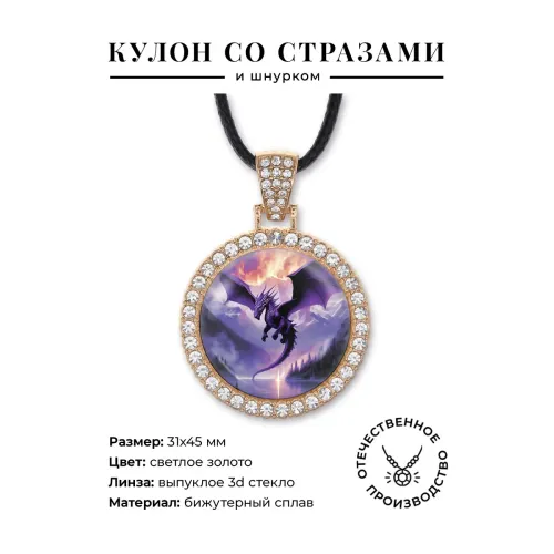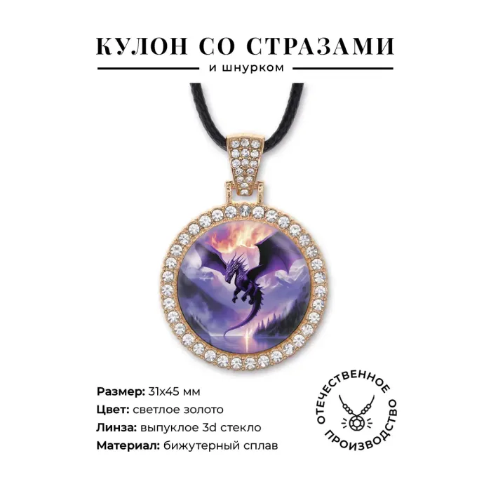 Кулон из бижутерного сплава в виде дракона, инкрустированный стразами и защищённый выпуклой стеклянной линзой.