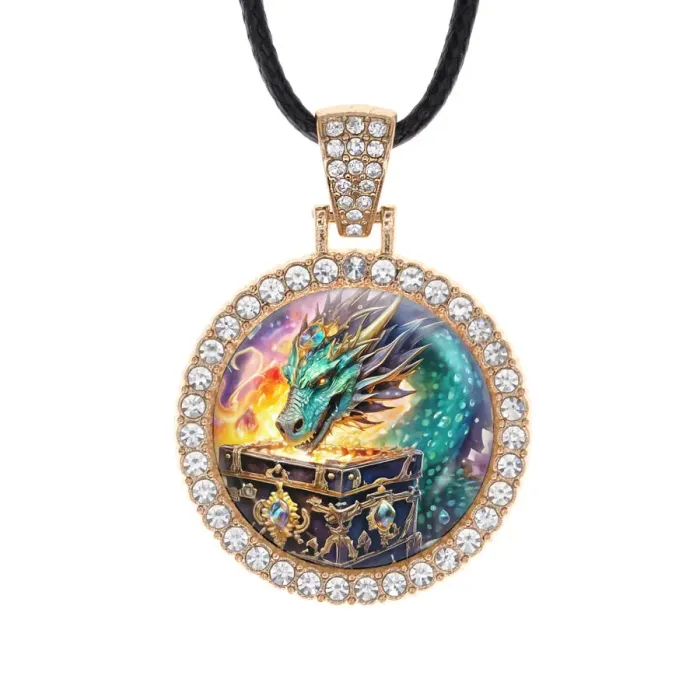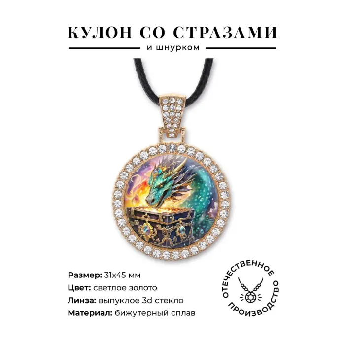 Кулон-амулет из бижутерного сплава с изображением дракона и сундука, инкрустированный стразами.