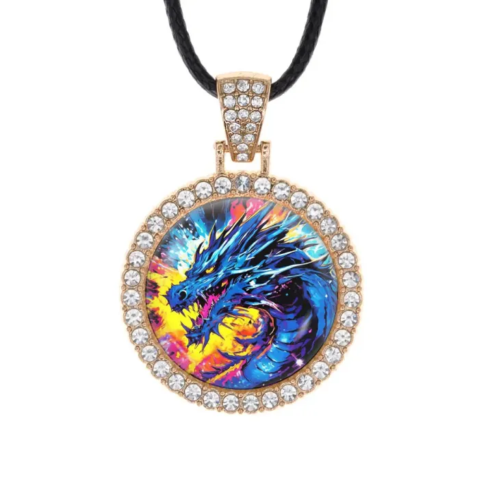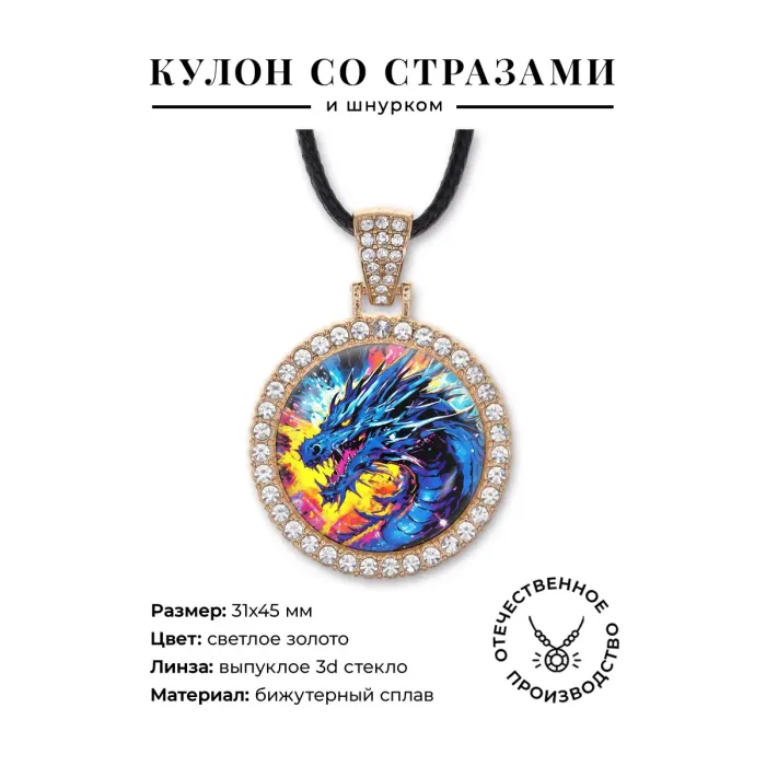 Кулон «Дракон» из бижутерного сплава со стразами и выпуклой стеклянной линзой.