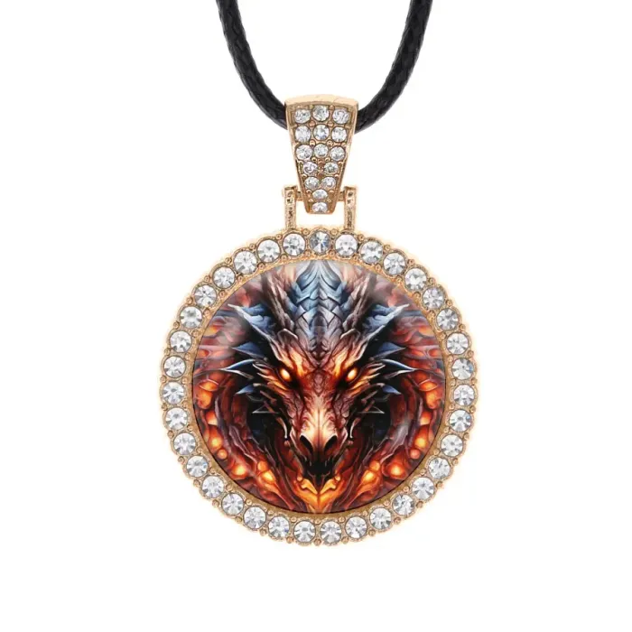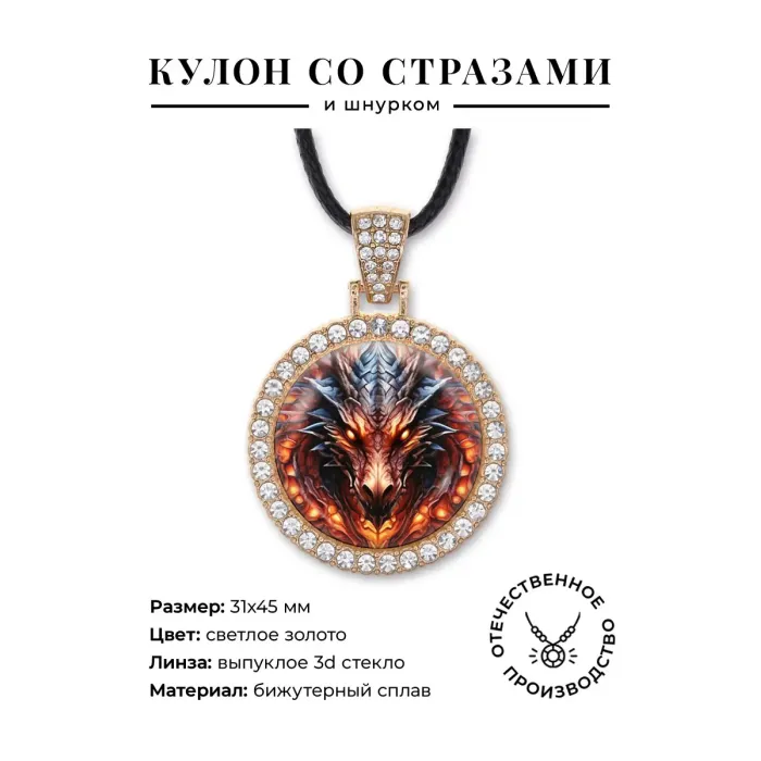 Кулон-амулет «Портрет дракона» из бижутерного сплава со стразами и стеклянной линзой.