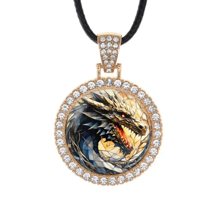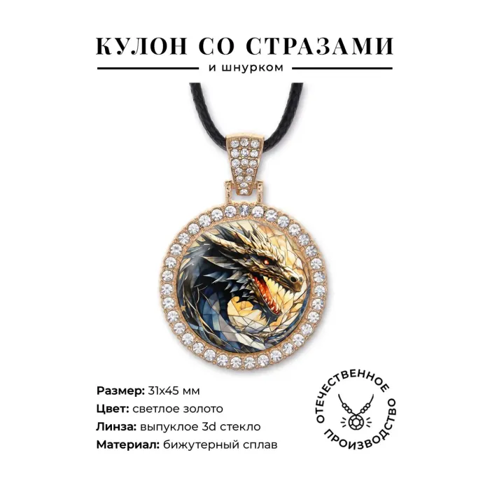 Кулон из бижутерного сплава с покрытием под светлое золото, инкрустированный стразами. Изображение защищено выпуклой стеклянной линзой.
