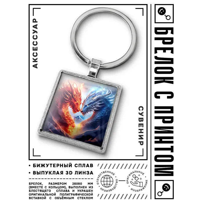 Брелок из бижутерного сплава с изображением драконов в символике Инь-Ян под выпуклой стеклянной линзой.