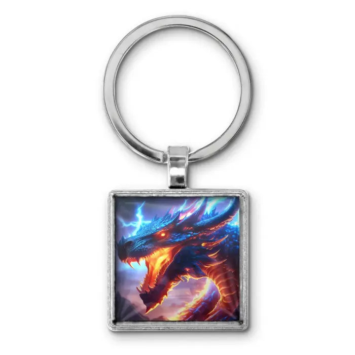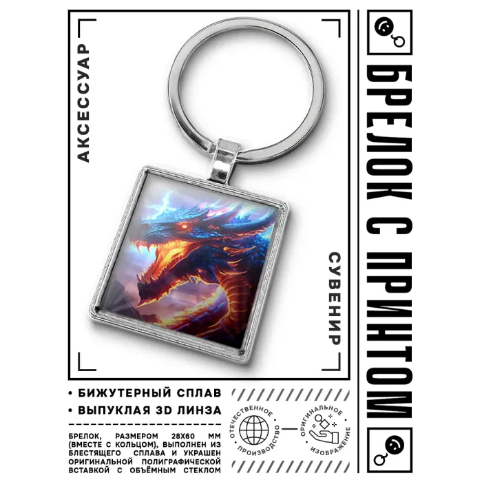 Брелок из бижутерного сплава и стали с покрытием под серебро. Изображение защищено выпуклой стеклянной линзой.