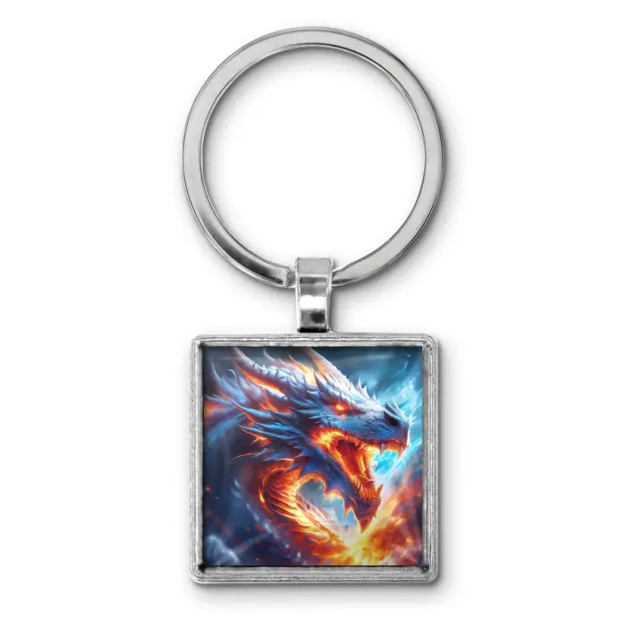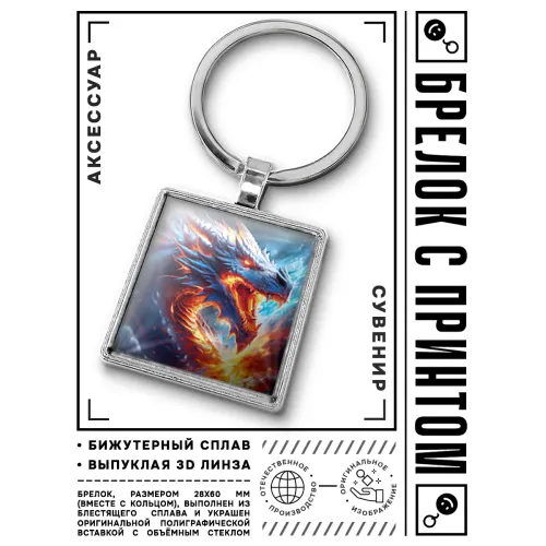 Брелок «Разъярённый дракон» из бижутерного сплава с изображением под выпуклой стеклянной линзой.