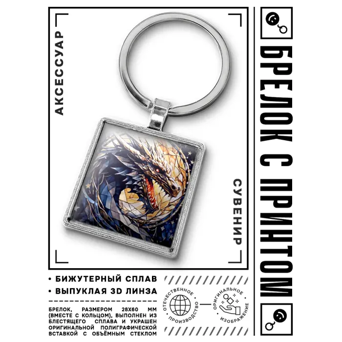 Брелок в виде профиля дракона из бижутерного сплава со стеклянной линзой.