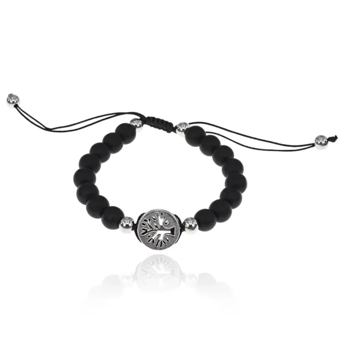 Браслет из бусин синтетического шунгита и металла с коннектором в виде символа «Дерево жизни».