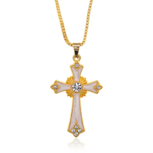 Кулон в виде креста из бижутерного сплава с покрытием под золото и эмалью, со вставками из страз.