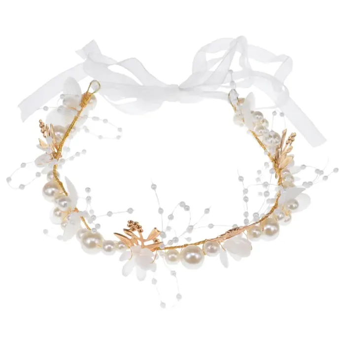 Лента для волос из бижутерного сплава и текстиля с декором из бисера и искусственного жемчуга.