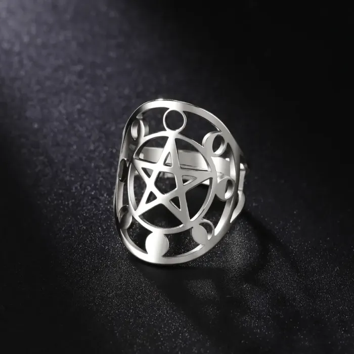 Это безразмерное кольцо с символикой пентаграммы и фаз луны станет стильным аксессуаром для любителей мистики и астрономии. Изготовлено из бижутерного сплава, оно покрыто слоем, имитирующим серебро, что придаёт изделию элегантный вид. Ширина кольца составляет 24 мм, что делает его заметным элементом в любом образе. Такое украшение может стать отличным подарком для тех, кто ценит уникальные вещи с глубоким смыслом. Кольцо не только подчеркивает индивидуальность владельца, но и имеет культурные корни в различных традициях.
