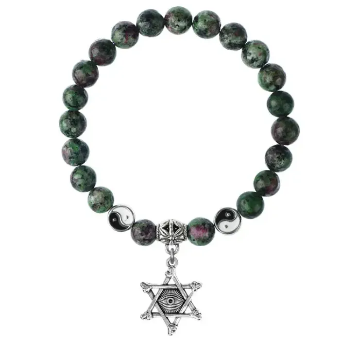 Браслет-амулет из синтетического камня цоизит с подвеской-талисманом из бижутерного сплава.