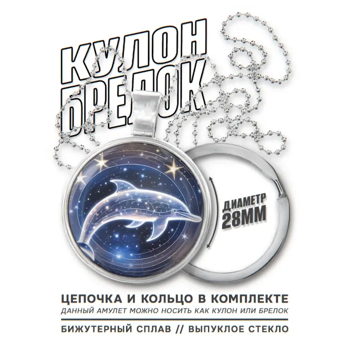 Кулон-брелок в виде дельфина из бижутерного сплава с креплением для цепочки или ключей.