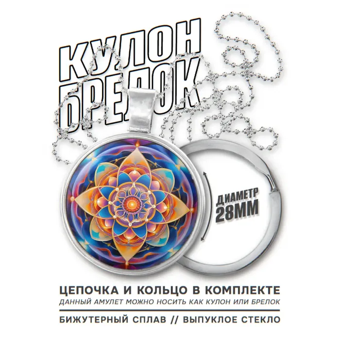 Размеры и комплектация: Диаметр 28 мм. В комплекте цепочка и кольцо. Упаковка — полипропиленовый пакет.