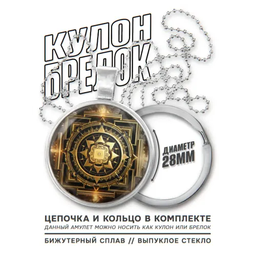 Размеры и комплектация: Диаметр кулона 28 мм. В комплекте цепочка, кольцо. Упаковка — полипропиленовый пакет.