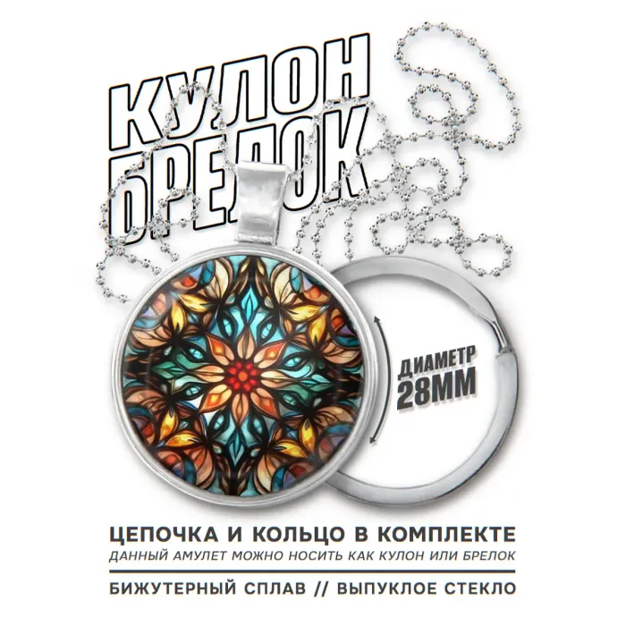 Размеры и комплектация: Диаметр 28 мм. В комплекте цепочка и кольцо.